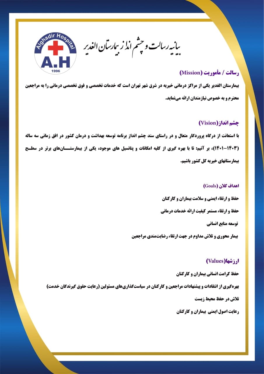 ما بر آنیم تا با همت و امید بر خداوند بزرگ و ارائه خدمات درمانی با کیفیت و قیمت مناسب در راستای ارتقای سلامت جامعه گامی بلند برداریم و همواره ارزش های خود را بر اصل مشتری مداری، تعهد و مسئولیت پذیری، شور و نشاط و همدلی، رعایت مسائل زیست محیطی و همچنین مشارکت و همدلی قرار نهاده ایم. امید است با این چشم انداز که همواره در حال خدمت رسانی به خلق خدا هستیم نائل به کسب عنوان درجه یک عالی اعتبار بخشی باشیم تا بتوانیم بیش از پیش در این راه گام برداریم.
